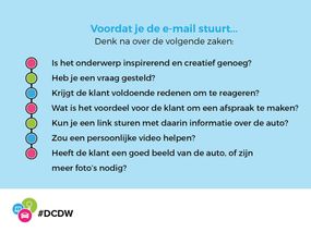 Kun je ook meer informatie sturen? Oftewel, een link met meer informatie over de auto? Bij een nieuwe auto stuur je bijvoorbeeld een link van een test gedaan door Autoweek of Autovisie. Of je stuurt een video en andere relevante zaken die voor het oprapen liggen. Als je erover nadenkt, dan vind je ongetwijfeld meer interessante informatie die je met de klant kunt delen.