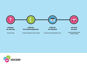 Stel het KCC/BDC heeft een afspraak gemaakt voor jouw, bevestig deze afspraak dan zelf als verkoper, stuur een e-mail, video met meer informatie over jezelf, wie en wat je bent en wat de klant van de afspraak mag verwachten. Iets in de trant van: Geachte heer de Vries, bedankt voor het maken van de afspraak hier bij ons, op vrijdag de 13de. Mijn taak is om u van alle informatie te voorzien, en nadat u in de auto heeft proefgereden ook een concreet voorstel kan voorleggen, zodat u thuis in uw eigen omgeving ons voorstel kan vergelijken met het onderzoek wat u heeft gedaan. Wilt u direct een beslissing nemen, ook dat kan natuurlijk! Mocht het zo zijn, dat u verlaat bent, laat het mij weten zodat ik mijn agenda voor u kan aanpassen. Met vriendelijke groet….etc